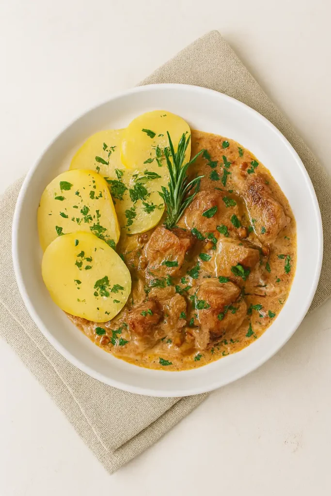 Intercalar láminas de patata y cordero dentro de la cazuela de la arrocera.