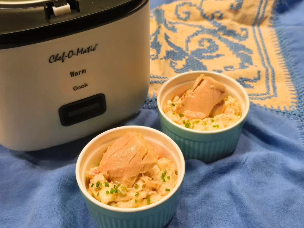 Juntar las tres hortalizas con los guisantes en la arrocera con 2 medidas de agua (vaso azul). Cerrar la tapa y pulsar Cook.