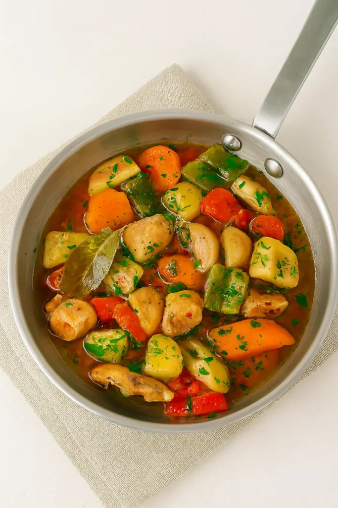 Add the whole crushed garlic cloves with their skins on, the bay leaf, peppercorns, thyme and rosemary.