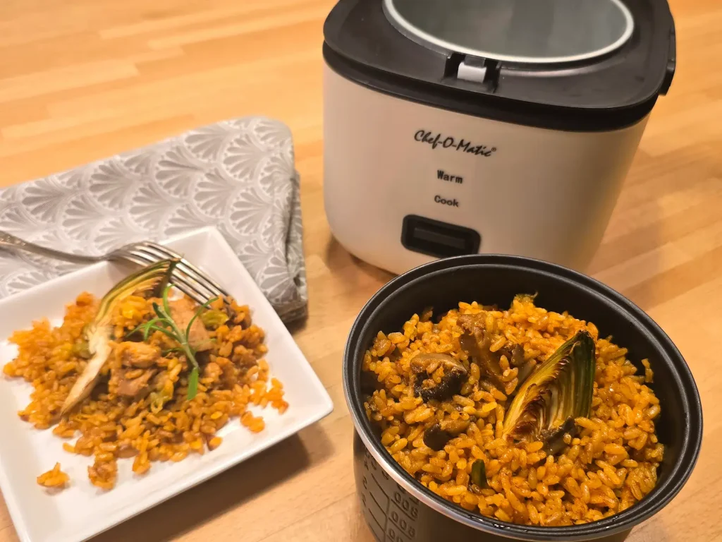 Colocar en la arrocera un buen chorro de aceite, la cebolla y las carnes. Salpimentar. Pulsar Cook.